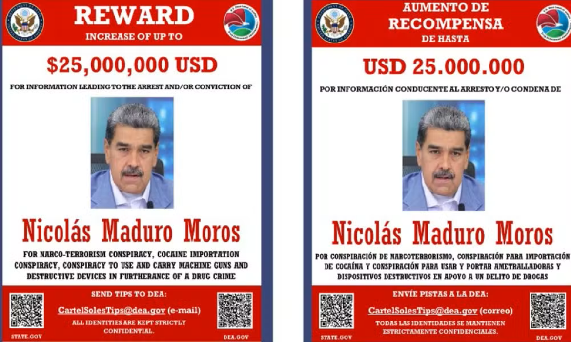 A Administração de Repressão às Drogas dos EUA (DEA) divulgou nesta semana que está oferecendo até US$ 25 milhões em recompensa por informações que levem à prisão ou condenação de Nicolás Maduro, presidente da Venezuela.