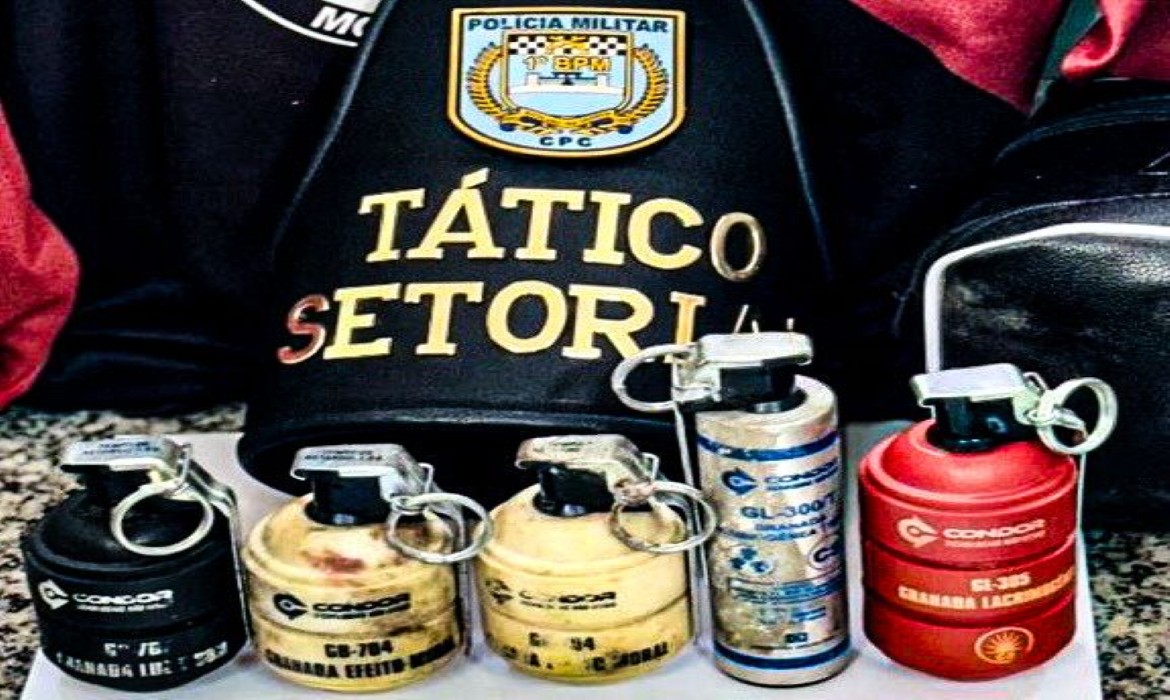 No momento da revista, os policiais encontraram dois artefatos de efeito moral, uma lacrimogênea tripla e uma de luz e som, armazenados em uma bolsa.